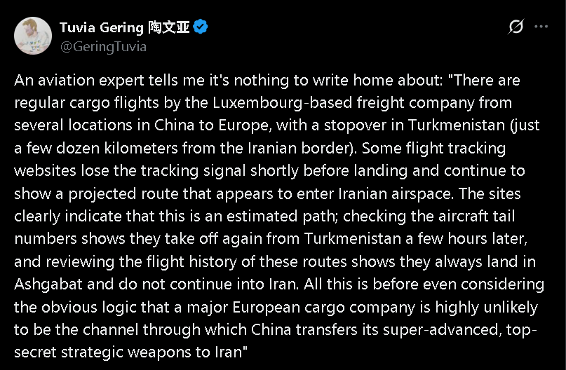 总之,事情到这里就很清楚了:国外一些航班追踪网站由于数据和算法存在问题,误判了卢森堡国际货运航空多架从中国飞往卢森堡的飞机的飞行轨迹,导致这些经停土库曼斯坦的飞机的飞行轨迹,被错误地显示在伊朗空域。