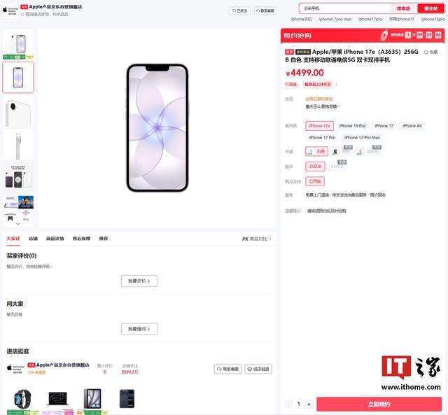 IT之家注意到,苹果 iPhone 17e 已上架京东开启预约,提供白色、黑色、浅粉色可选,并拥有 256GB 和 512GB 两种规格版本。该机将于 3 月 4 日 22:15 接受预购,3 月 11 日正式发售。